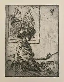 Fiske was known for her strong depictions of women in traditional scenes, such as women in interiors, with power, instead of gentility and fragility.[8] She included both men and women in her compositions, used bold colors, and was well respected for her likeness of male artists. She often portrayed distinctive New England characters (including florists, craftsmen, postmen, fishermen and clerics), in a style popular throughout the 1920s.[9] Fiske also painted landscapes, including of Revere Beach, a stone quarry in Weston, MA, and the Navy Yard in Portsmouth, NH. Later works included the introduction and adoption of modern technologies such as the telephone and automobile. Selected compositions include The Window (1916), The Carpenter (about 1922), Sunday Afternoon (about 1925), and Jade (about 1930).[10] Her sense of composition was considered "harmonious" and "warm."[11] The Carpenter won the Thomas B. Clarke prize from the National Academy of Design.[12]