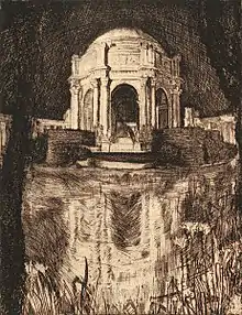 Albright was often commissioned to make portraits, and her portrait etchings drew praise for their skillful likenesses and clear, minimal lines.[2] She is also known for her Cubism-inflected Post-Impressionist landscapes done in oil on wood.[1] Critics noted the strong influence of Paul Cézanne on her paintings but considered that her work succeeded on its own merits.[6][7] She exhibited widely, winning a bronze medal for one of her portraits at the 1915 Panama–Pacific International Exposition.[2][3][8] Her work is in the collections of museums including the Metropolitan Museum of Art, the Oakland Museum, and the De Young Museum.[3]
