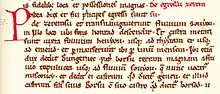 The work exists in a sole manuscript.[22][2] The codex is 17 by 24 centimetres (0.56 ft × 0.79 ft) in size and contains 24 folios, including two blank pages.[1] The first page of the codex originally contained the beginning of the Gesta.[23] It was blanked because the scribe had made mistakes when writing the text.[23][24] The work was written in a Gothic minuscule.[1] The style of the letters and decorations, including the elaborate initial on its first page, shows that the manuscript was completed in the middle or in the second part of the 13th century.[1][2] Scribal errors suggest that the extant manuscript is a copy of the original work.[1][2] For instance, the scribe wrote Cleopatram instead of Neopatram in the text narrating a Hungarian raid in the Byzantine Empire although the context clearly shows that the author of the Gesta referred to Neopatras (now Ypati in Greece).[1]