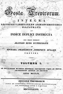 The Gesta Treverorum (Deeds of the Trevians) is a collection of histories, legends, wars, records of the Archbishops of Trier (Trèves), writings of the Popes, and other records that were collected by the monks of the St. Matthias' Abbey in Trier. It was begun in the 12th century and was continued until 1794 when the Archbishopric of Trier came to an end. An edition was published as an eight-volume set in the 19th century. A new 8-volume edition by Emil Zenz was published in the 1950s and 1960s.