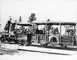 ![]() The Get Out and Push Railroad in 1887, "with seats all around and a place in the center for baggage"[1] | |