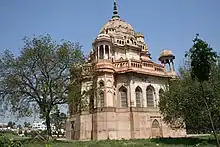 Several monuments in Lucknow were constructed by Ghazi-ud-Din Haidar. He built the Chattar Manzil palace and added the Mubarak Manzil and the Shah Manzil in the Moti Mahal complex for better viewing of the animal fights. He also constructed the tombs of his parents, Sadat Ali Khan and Mushir Zadi Begum.[5] For his European wife, he constructed a European style building known as the Vilayati Bagh. Another creation, the Shah Najaf Imambara (1816), his mausoleum, on the bank of the Gomti is a copy of the fourth Caliph Ali's (R.A) burial place in Najaf, Iraq. His three wives, Sarfaraz Mahal, Mubarak Mahal and Mumtaz Mahal were also buried here.