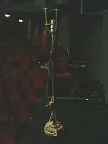 A ghost light is an electric light that is left energized on the stage of a theater when the theater is unoccupied and would otherwise be completely dark. It typically consists of an exposed incandescent bulb, CFL lamp, or LED lamp mounted in a wire cage on a portable light stand.[1] It is usually placed near center stage. Ghost lights are also sometimes known as equity lights or equity lamps, possibly indicating their use was originally mandated by the Actors' Equity Association.[2][3]