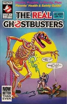 ![]() Peter Venkman and Ray Stanz of the Ghostbusters battle a ghostly animated Tyrannosaurs Rex skeleton. From The Real Ghostbusters Vol.2 #4. From NOW Comics. | |