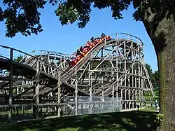 Ghoster Coaster opened, along with the entire park, on May 23, 1981, as one of the four original roller coasters to open with the park. The other three were Dragon Fyre, the Wilde Beast, and the Mighty Canadian Minebuster. All three wooden coasters were designed by Curtis D. Summers and built in-house by the Taft Broadcasting Company.[2] Some sources claim Philadelphia Toboggan Company (PTC) built these coasters, but PTC stopped building coasters in 1979.[3]