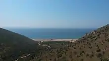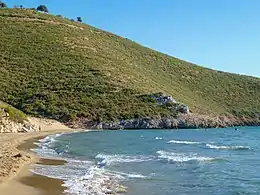It is situated on the Ionian Sea coast and it is the northwesternmost publicly accessible beach of the Peloponnese (north of the beach there is a restricted area belonging to the Araxos Naval Fort). The beach lies between two hills. The hills and the surrounding area of the beach were covered with kermes oaks and other trees and bushes native to the Mediterranean region, but multiple forest fires (in 2011, 2012, 2014 and 2017)[3][4][5][6] destroyed completely all of the plantation. The beach is accessed through a partly dirt unpaved road that is starting from the village of Akrotirio Araxou. During the summer months it is a popular destination for locals. The only facilities during the summer period is a small canteen/beach bar.