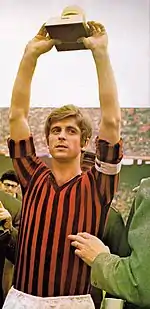 In the 1967–68 season, Nereo Rocco returned to the club and rebuilt the team's offence around Rivera; as a result, Milan managed a double, as the team won both the Scudetto, and the Cup Winners' Cup final, with a 2–0 win over Hamburger SV in the latter tournament. Rivera scored 11 goals in Serie A as Milan won the league title with a nine-point advantage over runners-up Napoli; he also played for Italy that summer as they won the 1968 European Championship on home soil, earning praise from journalist Gianni Brera, who described him as the greatest Italian player post-World War II.[1][7][9][32] Despite his performances and success throughout the season, Rivera missed out on the Ballon d'Or however, which was awarded to European Cup winner George Best, with Rivera finishing in ninth place in the final rankings.[7] The next season saw Rivera and Milan emerge victorious in the European Cup, winning the final over Johan Cruyff's Ajax, a match which is regarded as one of Rivera's greatest, most dominant, and most virtuosic performances: playing in the number 10 role, Rivera captained Milan to a 4–1 victory at the Santiago Bernabeu stadium in Madrid, setting up two of Prati's three goals in the final.[1][7][8] In addition to the European Cup that season, Rivera also won the Intercontinental Cup in a physical encounter against Estudiantes, scoring a goal in a 2–1 defeat in the second leg, after Milan had won the first leg 3–0; these successes finally earned him the Ballon d'Or in 1969, making him the first Italian-born player, and the second Italian player after Omar Sívori, to win the award.[1][2][7][8][9][22]