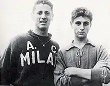 Rivera made his Milan debut on 18 September 1960, in a 3–5 away win over his former club Alessandria in the Coppa Italia, under manager Giuseppe Viani, who later gave Rivera his famed nickname the Golden Boy.[1][2][22][24] Rivera's Milan league debut came in a 3–0 home win against Catania on 25 September,[1] and he later also appeared in a 5–1 win over Bologna on 9 October 1960;[2] he scored his first goal with Milan on 6 November, the match-winning goal in a 4–3 away win over Juventus, at the age of seventeen.[29] During his first season with Milan, he played alongside several legendary Milan players, such as Cesare Maldini, Giovanni Trapattoni, Dino Sani, Fabio Cudicini, and José Altafini, among others, immediately breaking into the starting line-up, and being handed the number 10 shirt, as Milan finished the league season in second place.[1][2][8][9][22][30] After initially struggling to gain playing time under new manager Nereo Rocco during the 1961–62 season, his second at the club, also being linked with loans to Vicenza and Juventus, Rivera won his way back into the starting line-up and played a decisive role as he won his first scudetto with Milan, scoring 10 goals in the league; in the title deciding match on 8 April 1962 against Torino, Rivera scored in a 4–2 win, as Milan won the title with two matches to spare. Throughout his career, Rivera formed an important relationship with the legendary manager and catenaccio mastermind; he played a key role in the club's successes under Rocco, who subsequently built a hard-working, winning team around Rivera that complemented the midfielder's creative playing style.[1][2][8][9][22][30][31] Due to his performances throughout the season, on 13 May 1962, aged just eighteen, Rivera played his first competitive match for the Italian national team at that year's World Cup in Chile.[2][9][32] A precocious talent, despite his young age, Rivera soon became known for his ability to orchestrate Milan's attacking moves, as well as his leadership within the team, and he served as the club's captain for 12 of his 19 seasons with Milan after being handed the armband in 1966, at the age of 23.[1][2][8][22][23][33]