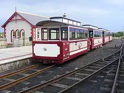 The Giant's Causeway Tramway, operated by the Giant's Causeway, Portrush and Bush Valley Railway & Tramway Company Ltd, was a pioneering 3 ft (914 mm) narrow gauge electric railway operating between Portrush and the Giant's Causeway. 9+1⁄4 miles (14.9 km) long, it was hailed at its opening as "the first long electric tramway in the world".[1] Promoted by W.A. Traill it was powered by hydroelectricity from an elevated third rail, although steam tram engines were also used in its earlier years, and the power supply was converted to overhead wire in 1899. It opened to Bushmills in 1883, the extension from there to the Causeway following on 1 July 1887. The line closed at the end of the 1949 season on Friday 30 September,[2] and was subsequently dismantled.