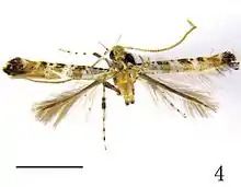 The wingspan is about 7 mm. The basal one-third of the forewings is white, with four black specks along the costa, of which the last one is smallest. The distal two-thirds of the forewings is ochreous yellow with a fuscous band along the costa and four white, nearly equally spaced fasciae which obliquely extend outwards from the costa to the dorsum. Two basal fasciae, approximately twice the width of the two distal ones, enclose a black spot on the costa. The hindwings are pale grey.