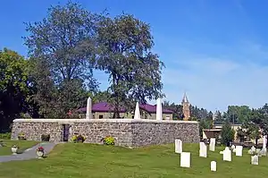 There are 161 marked graves scattered around the property, in no regular pattern. Most headstones are of marble or granite; some are unadorned and others show common 19th-century funerary art such as urn-and-willow motifs. On a rise in the north central portion is the Putnam family plot, surrounded by a fieldstone wall with smooth stone coping. Access to it is provided by a wrought iron gate with stone lintel. The graves of Gideon Putnam and his wife are marked by obelisks.[1]