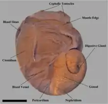 The oesophageal gland is fused and enlarged to fill the entire ventral side of mantle cavity.[3] It is occupying 0.6% of visceral mass volume in juveniles, while it is increasing allometrically up to 9% visceral mass volume in adults.[3] Blood sinuses are large, but few and fixed in position.[3]
