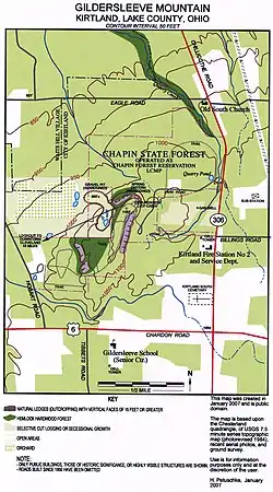 About 60% of Gildersleeve Mountain is within the 370-acre (1.5 km2) Chapin Forest Reservation, which was acquired by the state of Ohio in 1949[3] and has been managed by the Lake County Metropolitan Park District since 1966, located along State Route 306/Chillicothe Road. It is managed as a recreational facility for the public and features picnic areas, sports facilities, and playgrounds, although none of these are located on the higher elevations. Trails that may be used for hiking, bicycling, horseback riding, and cross country skiing in winter cross the public lands and circle the summit.