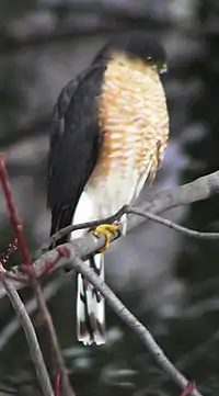 Many species of birds can be found on Gildersleeve mountain. Barred owls are common year round residents and can be found by listening and watching carefully. They will often sit close to the trials in clear view but hidden in the shadows of the branches. Most visitors are oblivious to their presence. Cooper's hawks, red-shouldered hawks, broad-winged hawks and red-tailed hawks also nest on the slopes. Wild turkey nests here. The spectacular pileated woodpecker, as well as hairy, downy, and red-bellied woodpeckers are common year round. Great crested flycatcher, eastern phoebe, eastern wood pewee and Acadian flycatcher are common nesters. Eastern bluebird is common in the more open areas, wood thrush is found nesting wherever trees create a canopy overhead. Black-capped chickadees, tufted titmice, white-breasted nuthatch are common residents and red-breasted nuthatch is sometimes found. Red-eyed vireos are common tree top nesters. Hooded warbler and American redstart are common nesters in the forest under story. Ovenbird, nests on the forest floor and Louisiana waterthrush nest is the ravines and creek beds. Eastern towhee is found in the underbrush. Scarlet tanager, rose-breasted grosbeak, American goldfinch, house finch, and song sparrow are also common nesters.