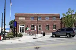 The Gillette Post Office in Gillette, Wyoming was built in 1935 by the Public Works Administration. The post office was one of the few monumental buildings in Gillette at the time and was a source of local pride. Designed by the Office of the Supervising Architect, the red brick building incorporates austere classical detailing. The front facade is two stories while the remainder of the building is one story. A full second story was not funded.[2]