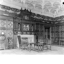 The Great Chamber is the principal room of the house as rebuilt by Sir William Fairfax, who held Gilling from 1571 to 1597. It survived the 18th century rebuilding almost unaltered and is a remarkable example of the richness and elaboration of a late Elizabethan interior. Sir William was keenly interested to demonstrate in heraldry his connections in Yorkshire, and he used it to decorate the newly built room, to such an extent that in the 1590s, inventories show, there was a book to which visitors could refer in order to identify the arms in plaster, paint and glass.[5] The glass has the signature of a Flemish artist and the date, 1585, which suggests that the room and its decorations were completed that year.