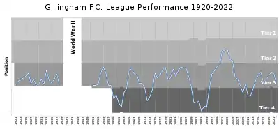 Taylor then left to manage Leicester City, and Andy Hessenthaler was appointed as player-manager.[25] He led the club to their best ever league finish of eleventh in the 2002–03 season,[6] but the following season saw the club narrowly avoid relegation on goal difference. Hessenthaler resigned as manager in November 2004,[25] and new boss Stan Ternent[26] was unable to prevent the Gills' relegation to League One. At the end of the 2007–08 season the club was relegated again, this time to League Two,[27] but an immediate return to the third level was secured via the play-offs after beating Shrewsbury Town in the final.[28] In the 2009–10 season, however, the Gills slipped into the bottom four on the last day, and were relegated back to League Two, having failed to win a single away game in the league all season.[29] This resulted in manager Mark Stimson having his contract terminated,[30] and Andy Hessenthaler was appointed as manager of the club for the second time.[31] At the start of the 2012–13 season Hessenthaler was replaced by Martin Allen, who led the club to promotion as League Two champions in his first season in charge.[32][33] However, shortly after winning League Two, Allen was sacked in what many saw as a surprise after a poor start to the season.[34] The club remained in League One from 2013 up until 2022, with a best finish of ninth, achieved in the 2015–16 season.[6] In the 2021-22 season, Gillingham were relegated back into League Two.[35]