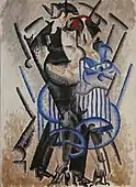 In 1916 Severini departed from Futurism and painted several works in a naturalistic style inspired by his interest in early Renaissance art.[4] After the First World War, Severini gradually abandoned the Futurist style and painted in a synthetic Crystal Cubist style until 1920.[4][5] By 1920 he was applying theories of classical balance based on the Golden Section to still lifes and figurative subjects from the traditional commedia dell'arte. He became part of the "return to order" in the arts in the post-war era. Works such as The Two Pulchinellas (1922) exemplify Severini's turn toward a more conservative, analytic type of painting, which nonetheless suggests metaphysical overtones.[4]