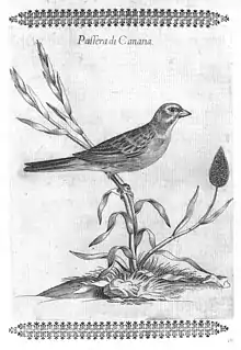 Olina's books is considered to include one of the earliest and most accurate illustrations of the canary.[3] Todi and Olina included a story of how canaries came into Europe due to the supposed wrecking of a ship from the Canary Islands of the island of Elba. Todi suggested that the island of Elba had cross-bred birds from the escaped canaries. A study of some paintings of the supposed "Elba canary" have however subsequently been ascribed to the Corsican race of the citril finch.[4]