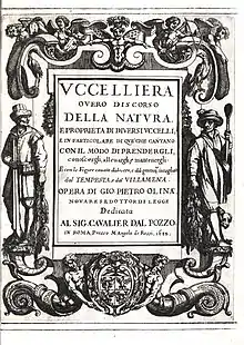 Giovanni Pietro Olina (1585 - circa 1645) was an Italian naturalist, lawyer, and theologian who is best known for his writings on the capture and maintenance of songbirds in the rare work Uccelliera, overo, Discorso della natura, e proprieta di diversi uccelli (1622) which was written (or ghost-written) at the behest of and with the support of Cassiano dal Pozzo who worked under Pope Urbano VIII.