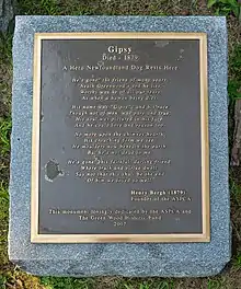 News of Gipsy's death was covered in several newspapers, including a story in which Gipsy saved Mrs. Wilmarth from drowning some years before his death.[1] The news inspired Henry Bergh, founder of the ASPCA, to write a poem for Gipsy.[3] The Wilmarths had plans to have a headstone erected, but it did not happen in their lifetime. In 2007, the ASPCA added a plaque bearing the full text of Bergh's poem on Wilmarth's plot, dedicated in a ceremony attended by Newfoundlands from local rescues.[4][5]