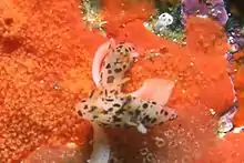 The giraffe spot nudibranch feeds on arborescent bryozoans. Its egg mass is a wavy white ribbon.
