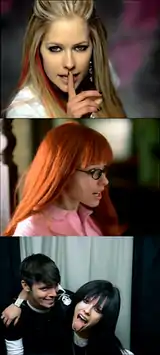 Unfortunately for her, the black-haired Lavigne and her friends happen to be present at the venue as well. As soon as she and her friends see them, black-haired Lavigne hits her in the head with a golf ball, resulting in the red-haired Lavigne splashing down into the water. Her boyfriend tries to grab her hand but misses, to black-haired Lavigne's amusement. Finally, the man, who eventually develops feelings for black-haired Lavigne, is seen waiting for her. As she comes toward him, they soon hold hands together, but red-haired Lavigne sees this and attempts to seize black-haired Lavigne. But black-haired Lavigne and the man manage to dodge her, and in her attempt to win back her boyfriend, she tumbles all the way down and lands in a portable toilet ahead, where she gives a look of desperation towards the camera, showing she has failed to do so, and signalling that black-haired Lavigne has finally won the man's affections. Blonde Lavigne then takes her new boyfriend into a bathroom stall and slightly opens the door after a moment and pumps her arm in victory.
