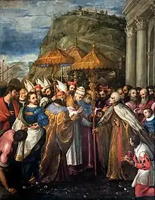 He learned design from Giuseppe Porta and color from Jacopo Palma il Giovane, painters with whom he collaborated on projects in the Doge's Palace.[1] In the Sala del Maggior Consiglio, he painted an episode of the History of Ancona, placed above the door leading to the Quarantìa della Sala. It depicts a meeting in Ancona between Doge Sebastiano Ziani, Emperor Frederick Barbarossa, and Pope Alexander III, where all three were given gold umbrellas by the citizens. The pope gives his to the Doge.