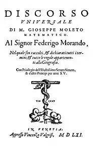 - Moleti, Giuseppe (1561). Discorso universale nel quale son raccolti et dichiarati tutti i termini et tutte le regole appartenenti alla geografia (in Italian). Venezia: Giordano Ziletti (1.).
