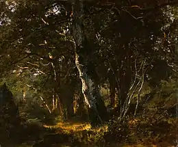 Giuseppe Palizzi moved to Naples in 1835 and enrolled at the Royal Institute of Fine Arts, where he came into contact with the painters of the Posillipo School, including Giacinto Gigante. He presented historical landscapes at the yearly shows, but strained relations with the academic world led him to leave Italy for Paris.[1] It was in 1844 that he settled at Paris and not long after at Bourron-Marlotte (Seine&Marne) on the edge of the forest of Fontainebleau. This became the primary subject of his painting, which developed in the direction of painstaking realism through the influence of the Barbizon School, among other things. He kept in contact with his brother Filippo by letter and shared the results of his artistic explorations. He exhibited regularly at the Paris Salon and, after a short stay in Italy in 1854, returned to France, where he achieved great success with landscape paintings that often included the figures of humble labourers. He was made a member of the Legion of Honour in 1859 and received the Italian decoration of the Cross of the Knights of St Maurice and St Lazarus in 1862. He died in Paris in 1888.