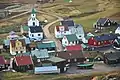 The village church dates from 1929. It was the first one to be consecrated in the village and the first one to feature services in Faroese. Before that, the villagers walked to Funningur for church and burial services.[1] On the opposite side of the road a sculpture stands as a memorial to fishermen lost at sea, bearing the names and ages of men from the late nineteenth to the mid twentieth century. The sculpture of a mother and two children looking out to sea was created by Fritjof Joensen.[2]