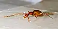 Glacicavicola bathyscioides is a shiny, translucent, brownish-orange, ant-like beetle, approximately 6 mm long by 2mm wide. It has become well-adapted to the troglobitic lifestyle: it has long thin antennae covered in fine setae, and slender legs (also covered in setae) which allow it to easily traverse the difficult terrain present in its environment.[2] The beetle is completely blind, lacking eyes and optic neuropiles.[3] Its abdomen exhibits false physogastry, which means that it appears larger than it truly is, due to the enlarged dome-like elytra which covers the entire abdomen.