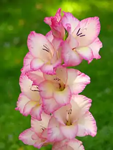 Gladiolus 'Priscilla' is a cultivar of Gladiolus (Gladiolus x gandavensis,[1] ) which has tri-colored flowers. They have a white ruffled flowers with pink edges, and a soft yellow throat.[2] The florets (6 - 7 per stem) are arranged on strong and erect spikes adorned by pointed sword-like leaves. Blooming in mid to late summer, this Gladiolus grows up to 4–5 feet (120–150 centimetres) tall.[3]