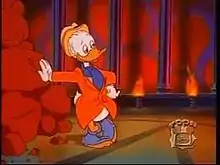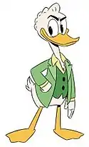 Gladstone makes two speaking appearances in the animated series DuckTales, where he was voiced by Rob Paulsen. In these episodes he is not characterized as much of a braggart he is in the comics but rather focusing much more on his care-free nature, and additionally acting a bit more foolishly. In the episode "Dime Enough for Luck", Gladstone is an unwitting stooge for Magica De Spell in one of her attempts to steal Scrooge's Number One Dime. He returns in the episode "Dr. Jekyll & Mr. McDuck", where he accidentally bids on an item that turns out to be valuable. This inspires Scrooge to bid on the next item—a trunk containing Dr. Jekyll's formula—which sets the plot in motion. He also makes non-speaking cameo appearances in the episodes "Sweet Duck of Youth" and "Till Nephews Do Us Part", as well in episode of House of Mouse titled "Goofy For A Day". Gladstone appears in the 2000 computer game Donald Duck: Goin' Quackers in his traditional role of Donald's rival for Daisy's affection, and every time a Boss Battle is about to start, Gladstone greets Donald, but always gets hurt, becoming squished by a giant bird, getting knocked off a building by a wrecking ball, being sent crashing to the bottom of a haunted mansion, and even gets sent back to Duckburg inside a pipe, and every time he gets hurt, he says that he has found a nickel. He also appears in the DuckTales reboot, first appearing in the episode "The House of the Lucky Gander!".[10] In this series, he is voiced by Paul F. Tompkins. This series brings his personality far closer to how he acts in the comics, although it is implied that he is genuinely unaware of how arrogant he is.