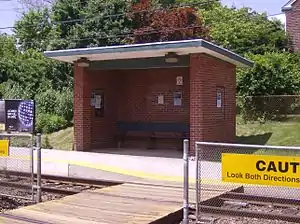 Gladstone station is a SEPTA Regional Rail station in Lansdowne, Pennsylvania. Located at Walsh and Madison Roads, it serves the Media/Elwyn Line. In 2013, it saw 208 boardings and 275 alightings on an average weekday.[2] The station includes a 108-space parking lot, and additional parking can be found on the opposite side of the tracks off Scottdale Road, which itself runs along Darby Creek, both of which are under a train trestle west of the station. Prior to being named Gladstone, this station was known as Burmont, and before that Kellyville.