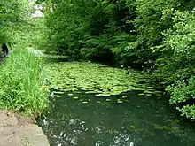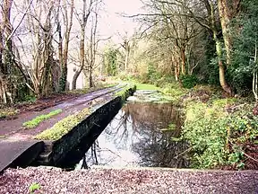 Today, limited traces of the canal remain, about one half being covered by the A470 Cardiff to Merthyr Tydfil trunk road, which was constructed in the 1970s.[10] Much of the Taff Trail between Abercynon and Merthyr Tydfil follows the line of the canal.[11] The section from Tongwynlais to the Melingriffith Tin Plate Works at Whitchurch has been retained in water and was used for fishing,[12] but is now the Glamorganshire Canal local nature reserve. In addition, there are a few bridges and locks which have not been destroyed.[13] There are also short stretches in water at Nightingales Bush and at Locks 31 and 32 in Pontypridd and there are plans for restoration here.[14]