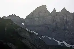 ![]() The Tschingelhörner on the border of Swiss cantons Glarus and Graubünden. The Glarus thrust can be seen as a horizontal line in the cliffs. | |