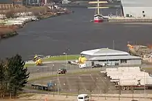 Prior to May 2014 the heliport was located approximately 1.5 mi (2.4 km) East from its present location, within the grounds of the Scottish Exhibition and Conference Centre and directly across the River Clyde from the Glasgow Science Centre and BBC Scotland's Pacific Quay Studios.[2] Planned future development of the SECC area enforced the move.[3]
