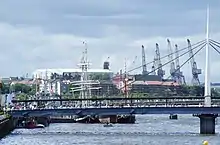 The festival site covered 120 acres (0.49 km2), including 17 of water, on the south bank of the River Clyde at Plantation Quay in Govan, and also on land reclaimed from the partial filling-in of the Prince's Dock basin. Once the largest dock on the River Clyde when opened in 1900, it had been closed to navigation in the early 1970s with the advent of Containerization. Continuing businesses including Smith & McLean Galvanisers were now resited elsewhere in the city. Most of the docklands required had already been sold by Clydeport Authority to Laing Homes. To ensure a clear site the Scottish Development Agency and Glasgow City Council identified suitable off-set sites within the city which Laing Homes then purchased and promptly developed, relinquishing their ownership of the dockland site.[1]