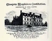 With its establishment in 1812 it had originated on Parliamentary Road until it moved to Lochburn Home in 1864 where it remained until its closure.[3] It was non-denominational and was funded by voluntary subscriptions – as well as the income generated from being a working laundry.[1] The women in the asylum were generally termed as prostitutes, however, this term was used in a very loose manner encompassing not only women who sold sex for money but also single mothers, socialists, mill girls and girls dressed "immorally."[4]