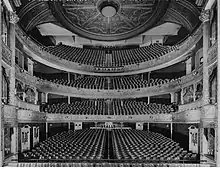 In 1879 the auditorium was destroyed by fire and was rebuilt to the classical French Renaissance design seen today of the renowned theatre architect Charles J. Phipps, creating three galleries instead of two and making the front door face Hope Street instead of Cowcaddens Road. It continued to accommodate about 3,000 people. It is now the largest surviving example of Charles Phipp's theatre work in Britain.[6]