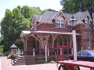 The site was a stop on the West Chester and Philadelphia Railroad beginning in 1858.[3] The original station was located across the track where the Glen Mills Store now stands. In 1880, the railroad became the Pennsylvania Railroad's West Chester Branch. The current station was built in 1882, and is believed to have been designed by Frank Furness.[4][5] It later became a part of SEPTA's West Chester line. SEPTA discontinued regular passenger service in September 1986, due to deteriorating track conditions and Chester County's desire to expand facilities at the nearby Exton station on the Paoli/Thorndale Line.[4]