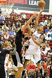 Following his first season, Rice was available to the Wizards on a team option for a salary of $816,000.[84] Rice joined the team for the 2014 NBA Summer League, where he averaged a league-leading 25 points as well as 7.8 rebounds, 2.5 steals and 2.3 assists.[85] He earned NBA All-Summer League 1st team (along with Wizards teammate Otto Porter) and NBA Summer League MVP recognition.[86] One of his highlights was a game-tying three-point shot in double overtime of the Summer League playoff quarterfinal game.[87] However, with the offseason acquisition of Paul Pierce, both Rice and Porter were expected to see limited minutes at small forward during the 2014–15 regular season.[88] Rice was the recipient of what the league ruled was a November 4 groin strike by J. R. Smith that led to a one-game suspension for Smith. Rice had been called for a personal foul on the play in a game against the New York Knicks.[89][90] On November 20, 2014 he was assigned to the Fort Wayne Mad Ants of the NBA Development League.[91] On January 7, 2015, he was waived by the Wizards.[92]