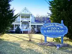 Glendale Springs Inn is a historic hotel building located at Glendale Springs, Ashe County, North Carolina. It was built in 1895, and expanded in 1902. A wing was added in 1905. It is a two-story, "T"-plan, frame structure with a steeply pitched intersecting gable roofs and sheathed in plain white weatherboard. It features a wraparound porch and second story balconies. It housed a vacation resort and inn for guests visiting the mineral waters at Glendale Springs. From 1935 to 1938, the inn housed the Works Progress Administration headquarters during construction of the nearby Blue Ridge Parkway.[2] The building was renovated in 1975 with a Family Style Restaurant, underwent subsequent renovations in 1995, and now houses a bed and breakfast inn.