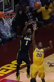 As a number four seed, Michigan defeated its first NCAA tournament opponent, South Dakota State, 71–56.[40] Michigan [4] Robinson tied his career-high again with 21 points. The 27th victory of the season gave the team its most wins in 20 years and matched head coach John Beilein's career high.[41] Michigan had held a narrow 30–26 lead at the half, but Robinson made two 3-pointers to open the second half.[4] He scored Michigan's first eleven second-half points as South Dakota only made one field goal in that time.[40] In the first two tournament games against South Dakota State and VCU, Robinson shot a combined 15-for-19.[42] On March 29 against Kansas, Robinson contributed 13 points and 8 rebounds,[43] bringing his averages in the first three tournament games to 16 points and 7.7 rebounds.[44] During the final media timeout with 3:47 to play and Michigan trailing by 10 points, Robinson became the vocal leader during the team huddle for the first time as a Wolverine reminding his teammates to focus on their defense.[4] With Michigan down by 5 points, he scooped a loose ball for an offensive rebound and made a reverse layup following a Tim Hardaway Jr. missed three-point shot with 35 seconds remaining.[45] It was part of a Michigan 14–4 run in the final 2:52 to force overtime in the victory.[45] On April 1, he was one of two Big Ten players (Harris) named to the 21-man 2013 Kyle Macy Freshman All-America team.[46] Michigan advanced to the April 8 national championship game where the team lost to Louisville by an 82–76 margin despite 12 points from Robinson.[47] Following his freshman season there was speculation he was considering entering the 2013 NBA draft. He was a projected first-round pick; however, on April 18, he and Mitch McGary held a joint press conference to announce that they would not enter the draft.[48]
