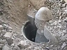To minimise visual impact from the coast the quarry is sited 1 mi (1.6 km) inland, and cut down into the mountain 1,600 ft (500 m) above sea level.However there is now considerable impact on the coastline from blasted rock faces and lights which spoil the night sky. Each explosive blast dislodges about 70,000 tons of granite, which is transported by dump truck to the primary crusher, which reduces it to lumps no bigger than nine inches in diameter.[2] It is then transferred by conveyor belt to a heap that covers the "glory hole", a 1,000 ft (300 m) vertical shaft 10 ft (3 m) in diameter, which is permanently full of rocks. At the base of the glory hole, deep inside the mountain, rocks are transferred to a horizontal conveyor and moved through a 1-mile-long (1.6 km) tunnel to the second crusher on the shore, where oceangoing ships are loaded in the deep-water docks at the rate of 6,000 tons per hour.[2]