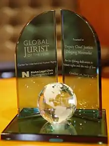 The Global Jurist of the Year Award or the Global Jurist Award is a recognition awarded annually by the Center for International Human Rights, an organization housed at the Bluhm Legal Clinic of Northwestern University School of Law.[1][2] The award recognizes a sitting judge in recognition of that judge’s contribution to the advancement of international human rights law or international criminal law. Special account is taken of those who have shown outstanding dedication to the rule of law and courage in the face of adversity, including personal risk.[3] Jurists from all nations and tribunals are eligible for consideration and nominations are accepted from the public, usually between January and March of the award year, with the final selection of the recipient being made by the faculty of the Center. The prize is presented during a visit by the recipient to Northwestern Law School during fall semester of the award year.[4]