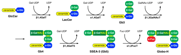 Globo H’s biosynthetic pathway is involved in the synthesis pathways of other globo-series glycosphingolipid antigens that are also specific to cancer cells, including stage-specific embryonic antigen-3 (SSEA3) and stage-specific embryonic antigen-4 (SSEA4).[1] The biosynthetic pathway of these antigens includes the enzyme β 1,3-galactosyltransferase V (β3GalT5).[1] β3GalT5 catalyzes the galactosylation of globoside-4 (Gb4) to SSEA3.[1] SSEA3 can then be converted to SSEA4 by sialyltransferase adding a sialic acid group to its end, or it can be converted to Globo H by fucosyltransferase adding a fucose ring to its end.[1] Playing a part in the formation of three different cancer-specific antigens, β3GalT5 is of particular interest in its relevance to cancer treatment, and it has been shown to be critical for cancer cell survival.[8]
