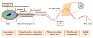Globozoospermia is a rare and severe form of monomorphic teratozoospermia. This means that the spermatozoa show the same abnormality, and over 85% of spermatozoa in sperm have this abnormality.[1] Globozoospermia is responsible for less than 0.1% of male infertility.[2] It is characterised by round-headed spermatozoa without acrosomes, an abnormal nuclear membrane and midpiece defects.[1] Affected males therefore suffer from either reduced fertility or infertility.[2] Studies suggest that globozoospermia can be either total (100% round-headed spermatozoa without acrosomes) or partial (20-60% round acrosomeless spermatozoa with normal sperm also identified in the sperm count,[3]) however it is unclear whether these two forms are variations on the same syndrome, or actually different syndromes.[2]