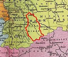 The first known account about the Glomacze is from 805 when they were raided by the troops of Frankish king Charles the Younger on his way to Bohemia. The actual conquest of the tribe started in early 929 by the German king Henry the Fowler who, as Widukind of Corvey reported, seized and destroyed their main castle called Gana at the siege of Gana (probably located near present-day Stauchitz), exterminated the defenders and had a fortress erected on the hill of Meissen (Mišno).[1] Their settlement area was incorporated into the large Saxon Marca Geronis and in 965 became part of the Margraviate of Meissen.
